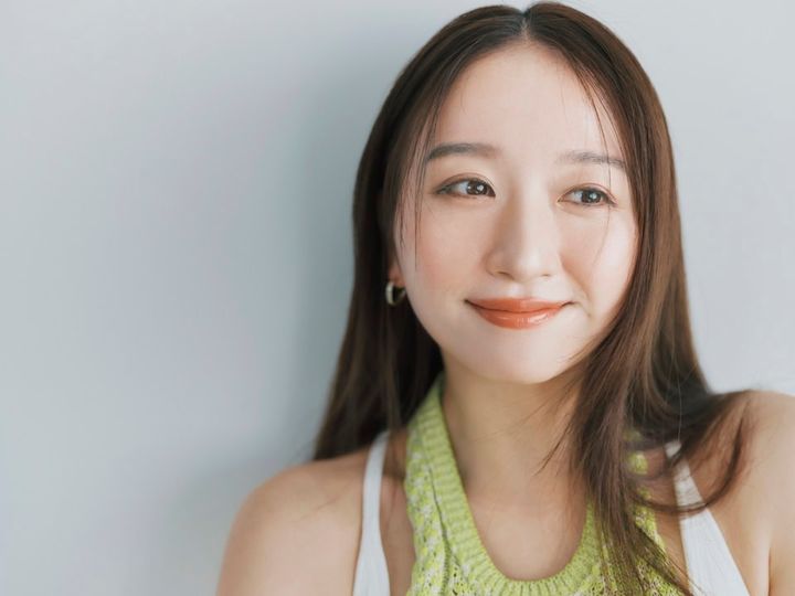 ライムカラーホルダーネックニット¥26,400(pelleq)、中に重ねた白タンクトップ¥17,600(HAKUJI/共にショールームリンクス) ピアス¥24,200(CAKI/ロードス)