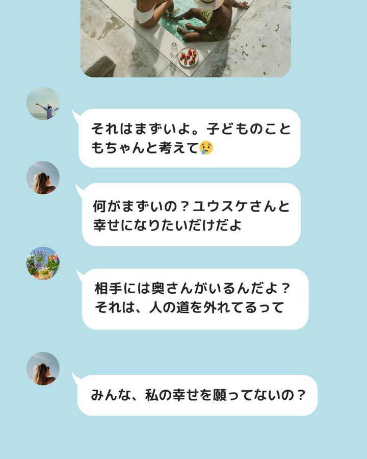 リサのSNSは、まるでユウスケさんとのラブラブ日記のようだった。不倫旅行中の写真。ユウスケさんからのプレゼント…。幸せそうな2人の姿。見るたびに、心臓がギュッと締め付けられた。