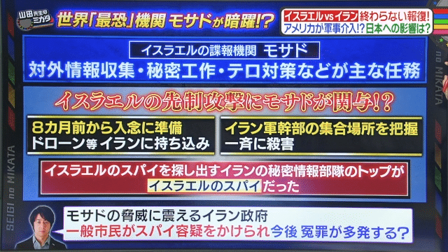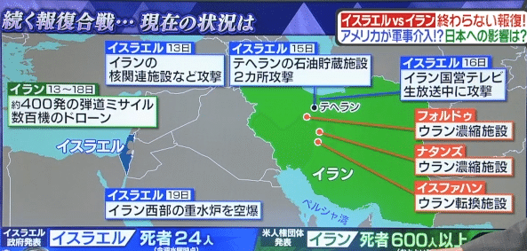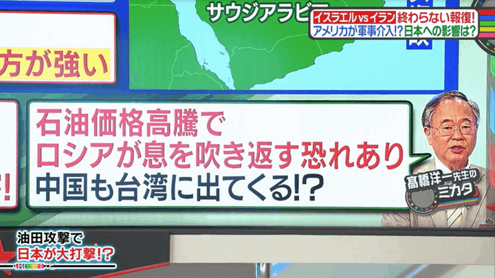 この日は、未だ続くイスラエルとイランの報復合戦が、テーマとして取り上げられた。もし、イランがこの争いで追い詰められて油田を攻撃すれば、石油が中東頼みの日本は、大損害を受けるだろう。もちろん、日本以外の国への影響も非常に大きい。