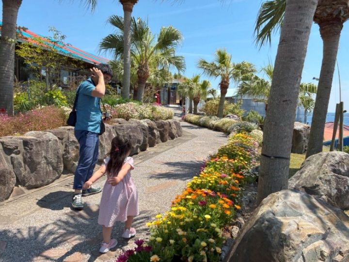 続いては宮崎県串間市にある「志布志湾大黒イルカランド」へ。といっても、実はダグリ岬遊園地から車で5分ほどの場所にあります。ランドへ入ると目の前に広がるのは志布志湾のパノラマ。そしていたる所に色とりどりの花やヤシの木が植わっていて青い空と海とのコントラストも素晴らしいんです。まさに「南国に来た!」という感じがして、県民ですら、ずっとワクワクしっぱなし♡そんなところもおすすめです。