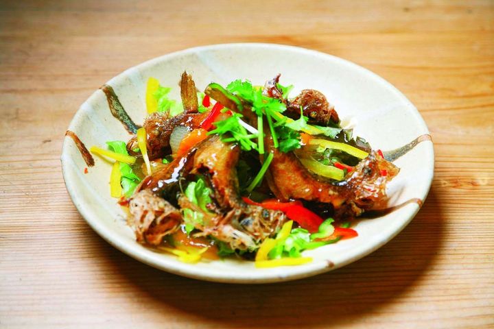 鳥取砂丘や日本海が一望できるロケーションもうれしい、新鮮な地魚を使った創作アジアン料理が評判のレストラン。写真の「はたはたのピリ辛ソース」時価(1尾1098円程度)は、県の特産品である“白ハタ”(旬は3~5月、9~10月)をピリ辛の甘酢ソースで和えた一品。「タイチャーハン」988円や「タイカレー」1008円などの定番メニューも人気です。