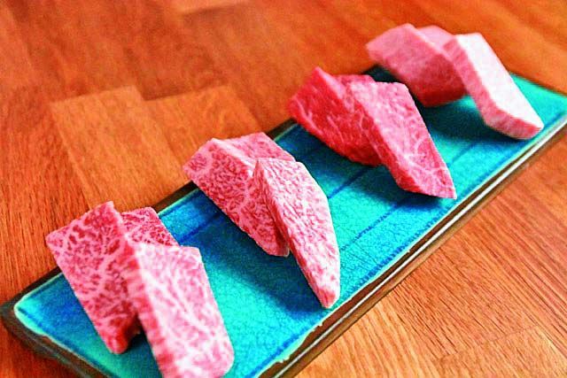 神話の国・万葉の里の厳選された4軒の生産農家でしか育てられていない“万葉牛”が味わえる焼肉店。「万葉牛厚切り盛り」(2人前)5350円は、盛られる部位は日替わりで、写真はヒウチ、ラムシン、シキンボ、クリミなどの希少部位。現地でなければまず食べられない“幻の肉”を堪能して。