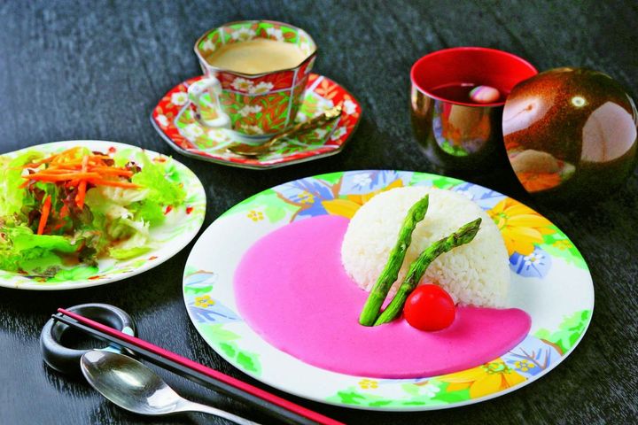 築70年を超える民家を改装した、和の趣漂う上品な店構えが特徴の和風カフェ。地元産のビーツを使用した目にも鮮やかな「ピンクカレー」が看板メニューで、見た目と味の不思議なギャップは旅の話のネタになりそう。ピンクカレーにサラダ、味噌汁が付く「ピンク華麗セット」は1500円。レトルト商品「華貴婦人のピンク華麗」1000円も販売されています。