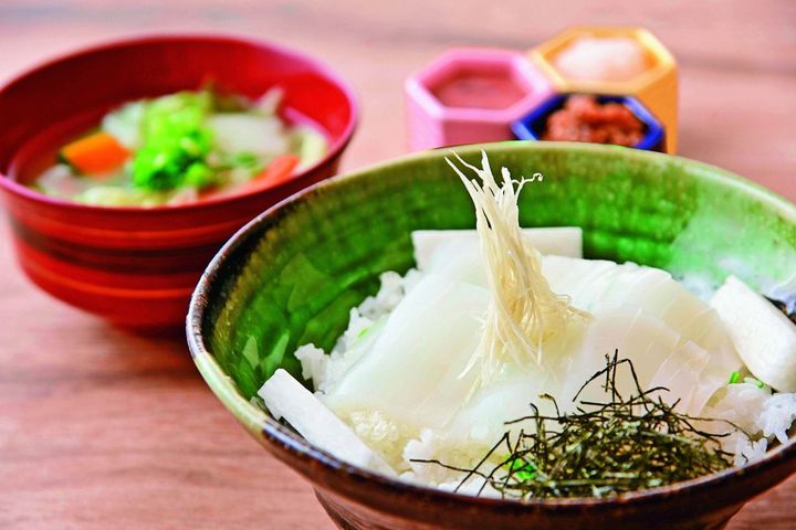 新鮮な海の幸が水揚げされる賀露港(かろこう)が近い、鳥取どんぶり専門店。酢めしの上に白イカをドンとのせた「元祖いか丼」1980円では、鳥取の夏を代表する味覚である、甘みが強く濃厚な味わいの“白イカ”を満喫できます。 酢めし中にはゲソの照り焼きが入っていて楽しみも2倍!