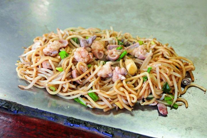 創業65年の鉄板焼専門店。看板メニューは、鳥取県産ホルモンと太麺を炒めた「ホルモンそば」860円。プリプリの食感と甘辛い濃厚な味わいで、後がけのピリ辛味噌ダレは半世紀以上継ぎ足し続ける秘伝の味。目の前で焼き上げるので、できたてアツアツが味わえるのもうれしいポイントです。