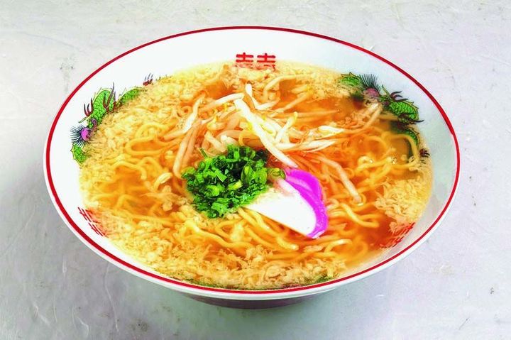 親子3代にわたって通う客もいる、明治45年(1912)創業の老舗食堂。2代目の店主が鳥取名物“素ラーメン”の生みの親といわれています。「素ラーメン」550円は、昆布とカツオの和風だしに鳥取県産小麦粉を使用した自家製麺に、具材はモヤシにネギ、かまぼこ、天かすがたっぷりと入っています。