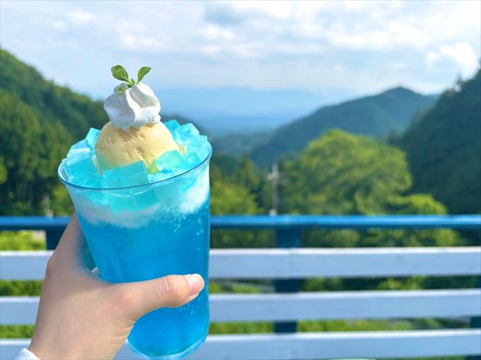 そんなUMIテラスの床一面は、鮮やかな青色。この美しいテラス、実はすべてDIYで手作りされたそうです。大自然の緑の中に突如現れる、海色のテラス席が、非日常感あふれる映えスポットとして話題になっています。