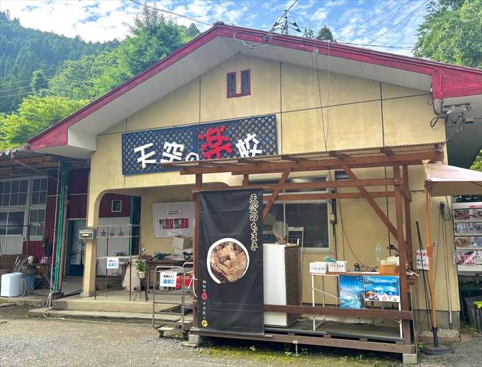 ここが「天空の楽校」! かつて小学校だった建物をリノベーションした、レトロな雰囲気のカフェです。まるで探検のような山道を進んでたどり着く、その“わくわく感”も、このカフェの大きな魅力の1つ。