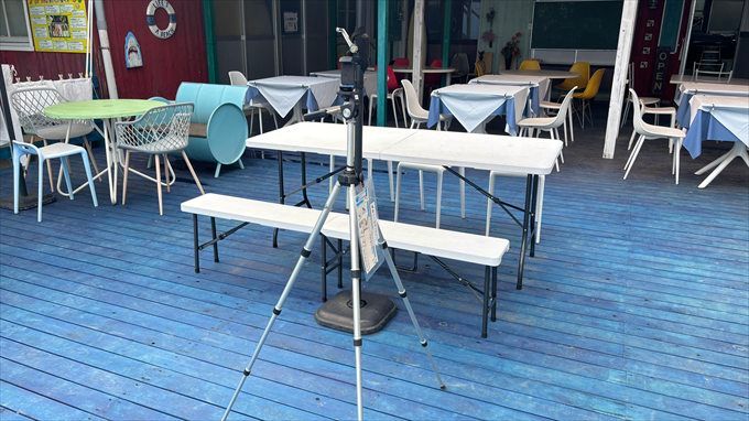 オーナーさんの粋な計らいで、テラス席には三脚が常備されています。「UMIテラスと一緒に写真を撮って、SNSに投稿してもらえたら」とのこと。訪れた際には、ぜひ絶景とUMIテラスを背景に撮影してみてください。