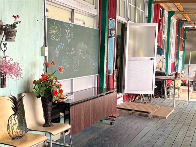 カフェの中には、元小学校の面影を感じさせる場所がいくつか残っています。廊下にある大きな黒板は自由に落書きができるようになっていて、訪れた人のイラストやメッセージがにぎやかに並んでいました。