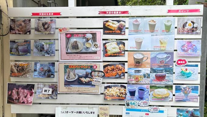 他にも様々なメニューがありました。筆者が訪れてた際には終了してしまっていた、ソーセージやスペアリブにチーズをたっぷりのせて、薪窯でじっくり焼き上げる名物「天空の窯焼き」も大人気!