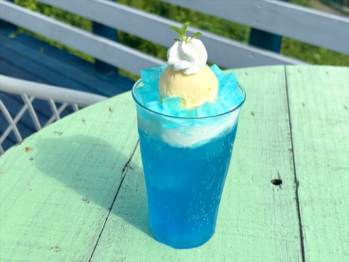 ドリンクの中でも1番人気というのが、UMIテラスの鮮やかな青色を表している「ブルーフロート」。青空と一緒に写真を撮れば、映えショットが狙えます。
