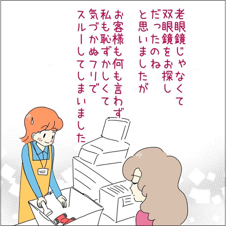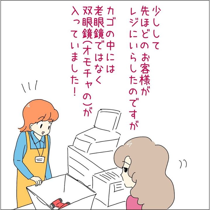 30代くらいのお客さんに「老眼鏡はどこですか?」と聞かれ、「まだ老眼鏡する年齢でもなさそうだけど、誰かに頼まれたのかな?」と思いつつ、案内したあとみさん。ところがそのお客さんがレジに持ってきたのは、おもちゃの双眼鏡だったそうです。聞き間違えていたと気付いたものの、恥ずかしさのあまり気づかぬフリをしたのでした。