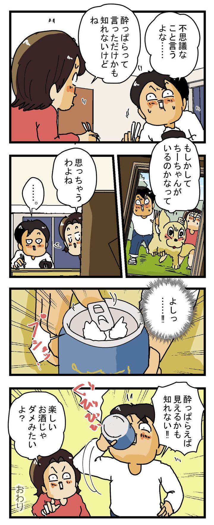 驚いているカツシンさんに対し、おじさんは「そうでしたか!可愛がって下さいね!」と笑顔で言い残し、帰って行ったのでした。帰宅後、カツシンさんはゆきたこーすけさんに「もしかしてちーちゃんがいるのかなって思っちゃうわよね」と話し、不思議な出来事を振り返るのでした。