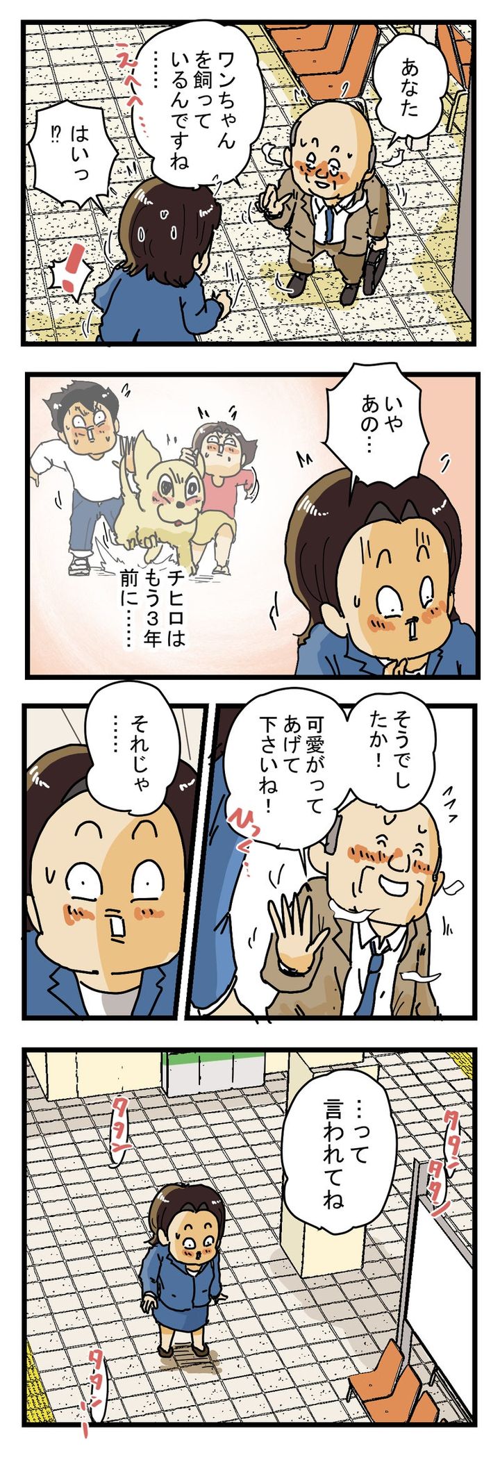 すると、おじさんはカツシンさんの顔を見て「あれ……?ワンちゃん……だな」と言い、「あなたワンちゃんを飼っているんですね……」と続けました。カツシンさんは、かつて飼っていた“チヒロ”という犬を思い出しますが、チヒロは3年前に亡くなっていたのです。