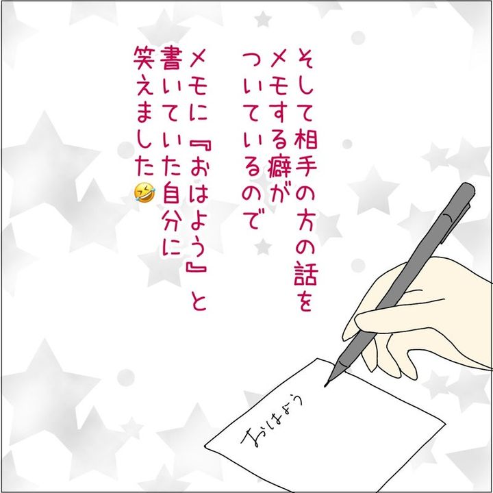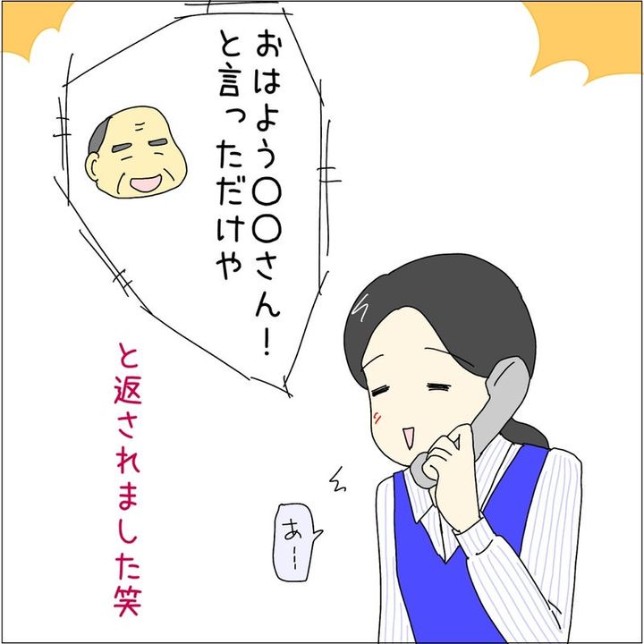 おそらく名乗ったのだろうと思いつつ、「もう一度お願いいたします」と聞き返した女性。するとお客さんは「おはよう〇〇さん!と言っただけや」と返してきたそうです。仕事柄、相手の話をすぐにメモしてしまう癖がある女性は、自分が「おはよう」と書いていたことに、後から気づいて思わず笑ってしまいました…。