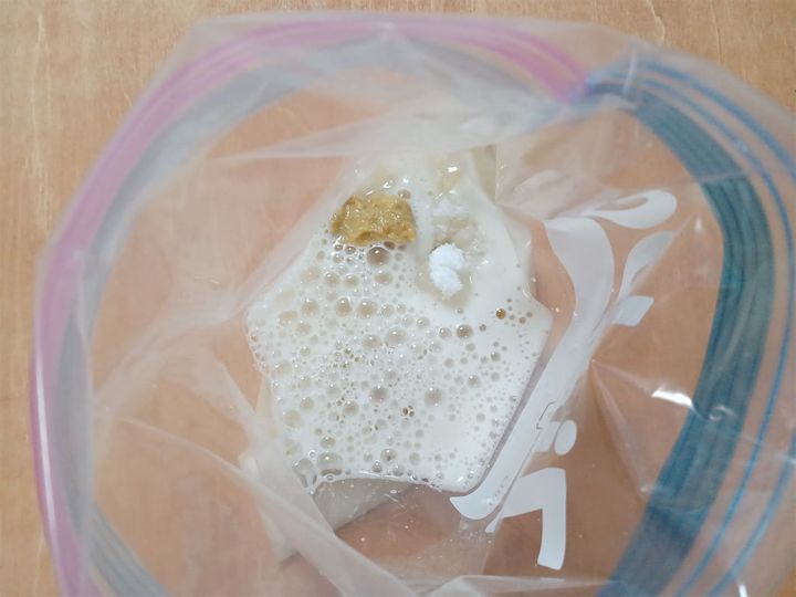 2. チャック付きビニール袋の中にビール、練りからし、砂糖を混ぜ合わせて、1を漬け込みます。