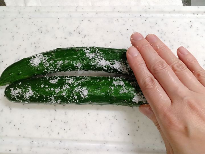 1. 下準備としてきゅうりを塩で板ずりしておきます。