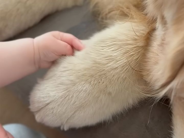 小さなお手と大きなモフモフの手が可愛い♡ そっと寄り添い、静かに心通わせる赤ちゃんと犬