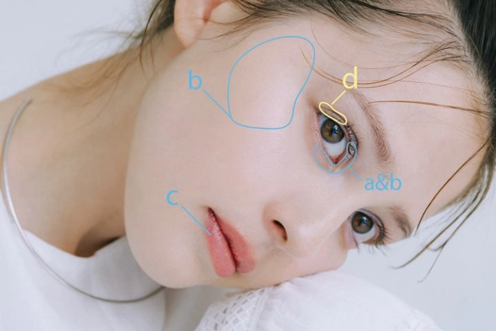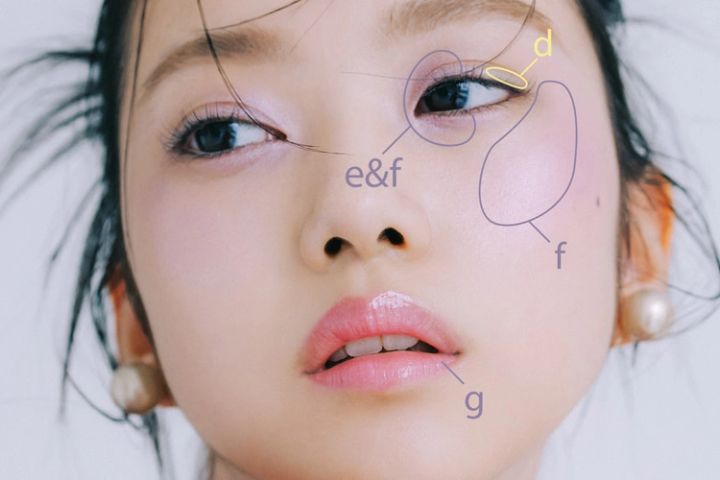 b、fのスティックを、それぞれ上下まぶたの目頭側とほおのCゾーンになじませる。さらに目頭は上からa、eのアイカラーを重ねて色みを出す。