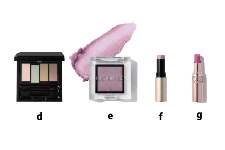リップはみずみずしいツヤ系のc、gを唇全体に直塗り。もともと血色感を含んだラベンダー顔はワントーンに、ブルー顔は少し血色を足すようにリップには赤み強めのものをあわせて。