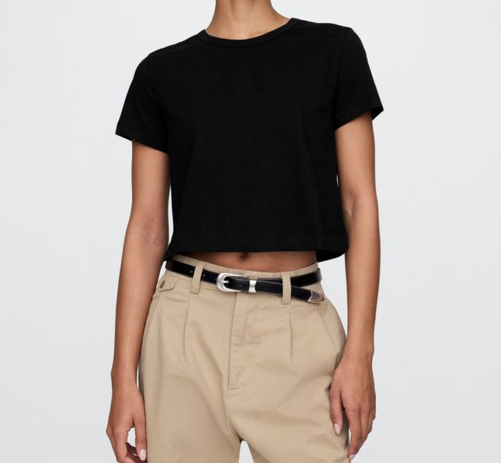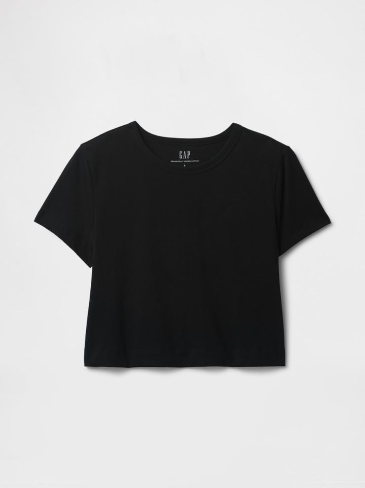 川瀬さんはベーシックなホワイトとブラックを購入。ブラックのTシャツって選択すると色あせが気になったりするので、これくらいのプライスだと、買い替えもしやすいですね。オーガニックコットン ヴィンテージソフト クロップドTシャツ¥3,490(Gap)