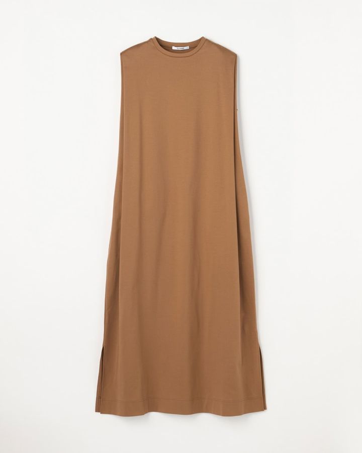 スローンのタンクドレスは写真のキャメルカラーとブラックの2色持っていると川瀬さん。「Tシャツドレスって何となく、手抜き?みたいに見えがちかなって思うのですが、これは全くそういう感じにならずキレイに着られて、暑い日にかなり助けられています!」。コットン コンパクトスーピマポンチ タックショルダーワンピース¥18,700(SLOANE)