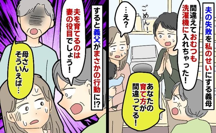 夫が使用済みおむつを洗濯「夫を育てるのは妻の役目!」え?なぜか私が義母に怒鳴られ…すると義父が!