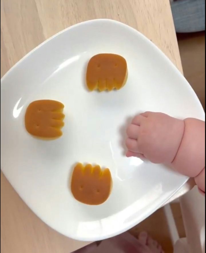 ちぃかま☺︎1y🎀+3m🎀(@chii_ka_mama)さんは「うちのお野菜パン」と、プレートにきれいに並べられた野菜パンの写真を投稿。するとそこには娘さんの小さな手がちょこんと紛れていました!