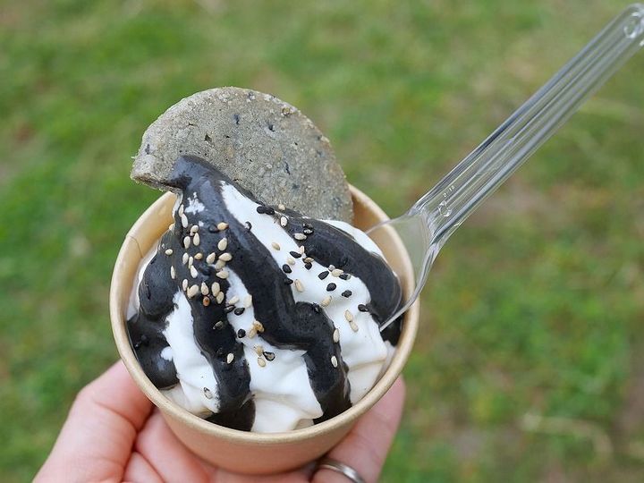 黒ゴマのソースがかかったソフトクリームに店内で販売している、“軟石クッキー”が添えられていて、ゴマ好きのハートを鷲づかみにするソフトクリーム♪