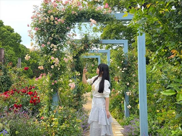 まさに“映えスポット”な「コレクションガーデン」のアーチ。奥まで続くガーデンの小道が美しく、アーチ越しに奥行きを意識して撮ることで、立体感のある写真に仕上がります!