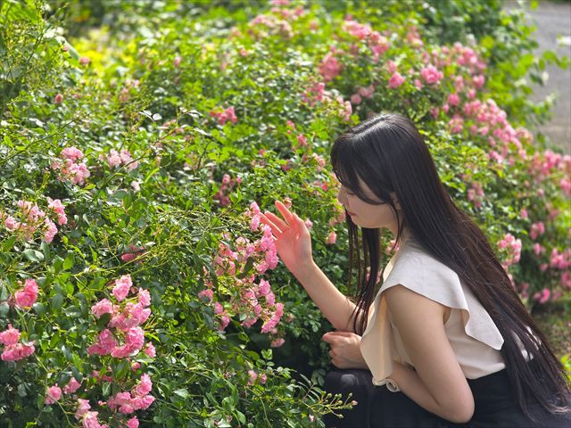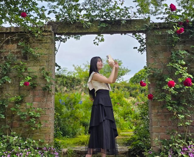 バラとレンガの組み合わせが、どこかレトロで上品な雰囲気に感じる「イングリッシュローズガーデン」。ここではスマホの「ポートレートモード」で撮影するのがおすすめ!