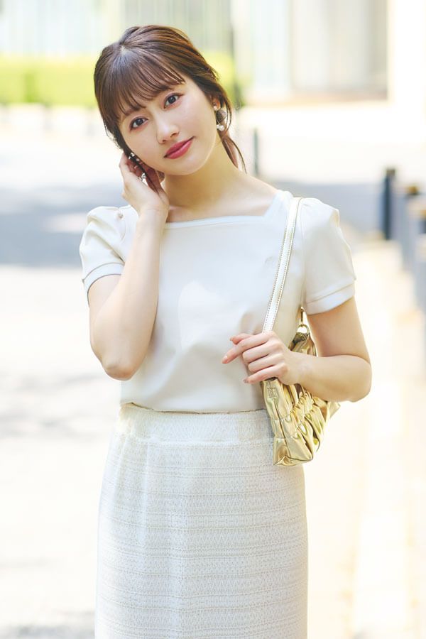 首元に抜け感を出して上半身の厚みを軽減。膨らみすぎないパフスリで、レディムードも堪能。