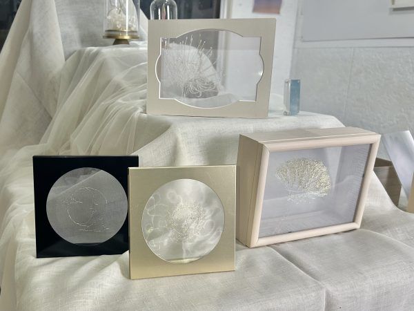 「大本としては刺繍の作品を作っていて、刺繍したものを飾ってもらうことが作品のベースになっています。ですが、刺繍自体が平面での表現なので、それだけでは表現に限界があると感じ、立体的なワイヤーを使った刺繍やオブジェ、箱を使って中を覗く形の作品を作り、ただ飾って楽しむだけではなく、ワクワクを体感してもらえるような視点の作品を作っています」と田村さん。 タイミングによってはアクセサリーを作ったり、写真を生かしてカレンダーなどのペーパーアイテムを作ったりもしているそうです。