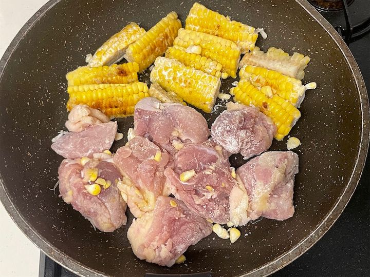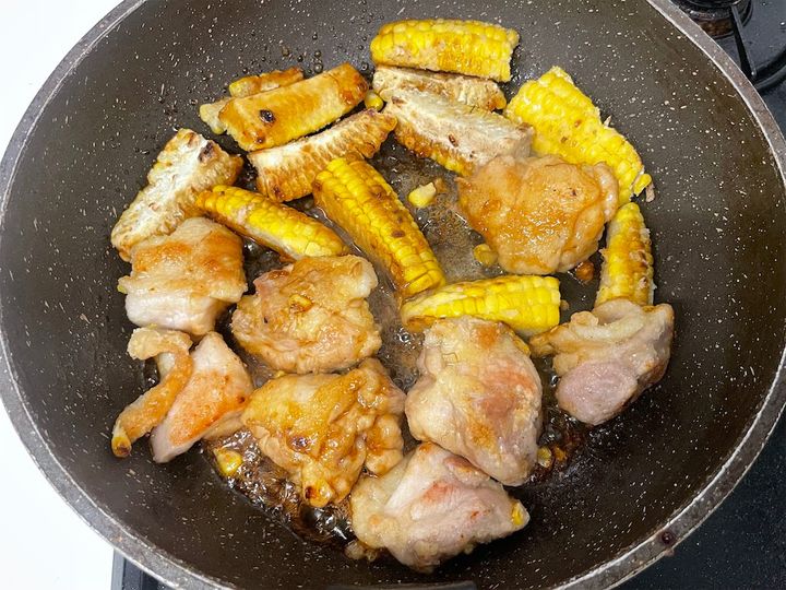 3. 程よい脂の鶏もも肉と一緒にトウモロコシ炒めたら…そりゃ、優勝でしょ!醤油バター味で甘くてコク旨♡