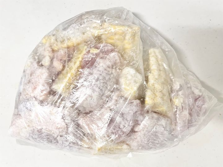 1. ポリ袋にとうもろこしと鶏もも肉を入れ、片栗粉と塩・こしょうを加えます。