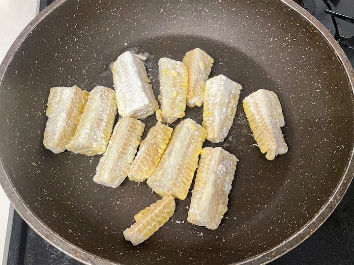 とうもろこしの焼き面を変えつつ、フライパンの半面にとうもろこしを寄せます。