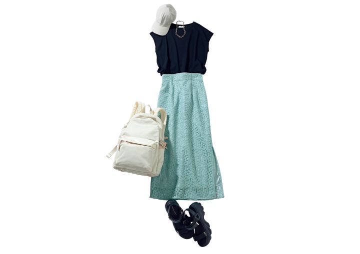 黒Tシャツ¥1,999/アース ミュージック&エコロジー(アース ミュージック&エコロジー 東京ソラマチ) タイトスカート¥18,700/ジャスグリッティー リュック¥21,450/ダイアナ(ダイアナ 銀座本店) スポーツサンダル¥8,800/オリエンタルトラフィック(ダブルエー) キャップ¥4,499/デッサン(ワールド) チェーンネックレス¥19,800/ステラハリウッド