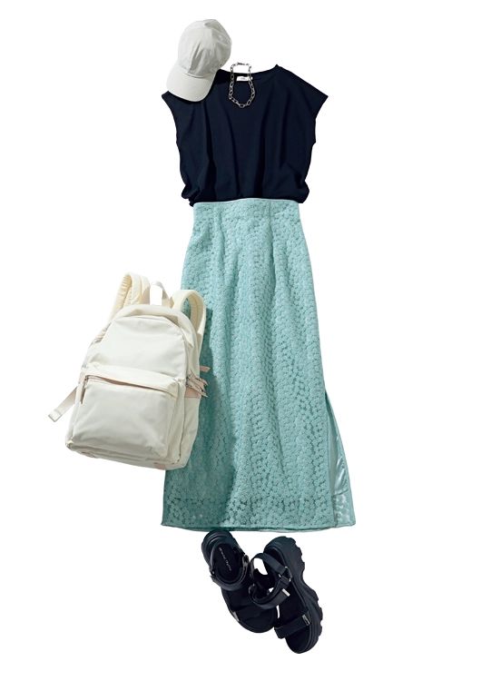 シンプルなTシャツとのワンツースタイルは目をひくカラーとデザインのボトムスで大人の遊び心をプラスして。アース ミュージック&エコロジーの黒Tシャツは接触冷感で涼しさもしっかりキープできます。レースのスカートは長時間座っていてもシワが気にならないからデスクワークの日に活躍。