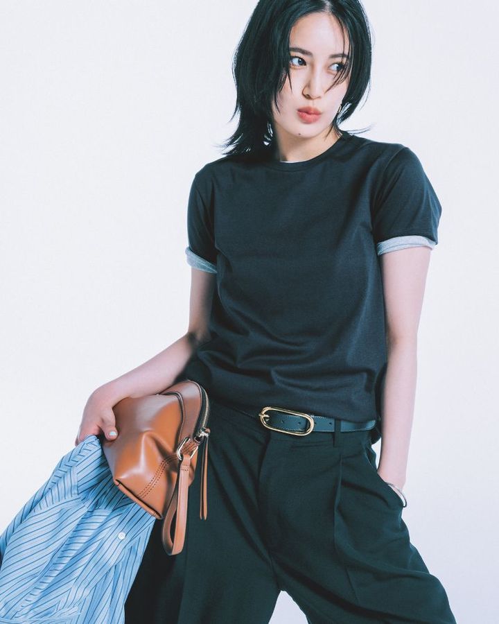 Tシャツ¥13,200(ギャルリー・ヴィー/ギャルリー・ヴィー丸の内店)中に着たTシャツ¥2,990(Gap)シャツ¥26,400(エイチ ビューティー&ユース)パンツ¥31,900(トラディショナル ウェザーウェア/トラディショナル ウェザーウェア ルミネ有楽町店)ピアス¥28,600(ブランイリス/ブランイリス トーキョー)リング¥49,500(Hirotaka/アバロン)バングル¥47,300(Hirotaka/ビームス 六本木ヒルズ)ベルト¥25,300(アトリエ アンボワーズ/アマン)バッグ¥45,100(フルラ/フルラ ジャパン)スニーカー¥37,400(オートリー/トヨダトレーディング プレスルーム)