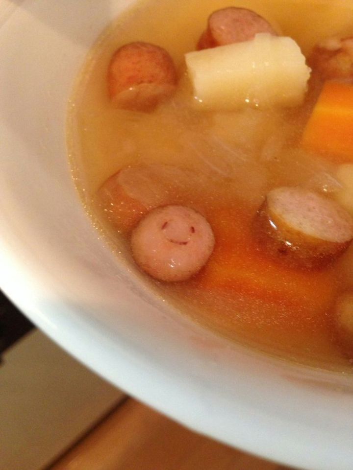 投稿者・犬養🎤🐕 @12万人感謝(@inukai1101)さんは、ポトフを作った際「幸せそうなソーセージ」を発見したそう。ソーセージのなんとも幸せそうな表情に、思わず心を奪われクスッと癒されます。