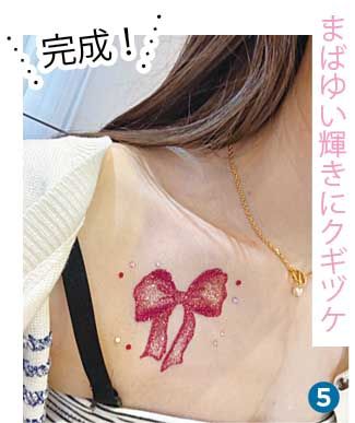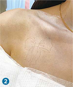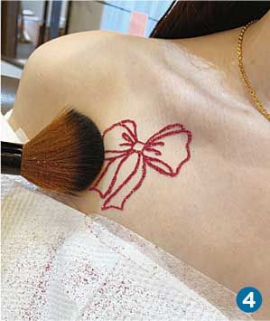 今回選んだリボンの形が肌に転写された状態。この絵柄の線に沿って、ブラシで専用グルー(のり)を塗っていく。