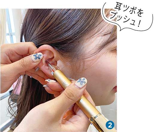 お悩みに添いながら、専用のツボ押しスティックで耳のツボを押していく。血行が高まりポカポカしてくる!
