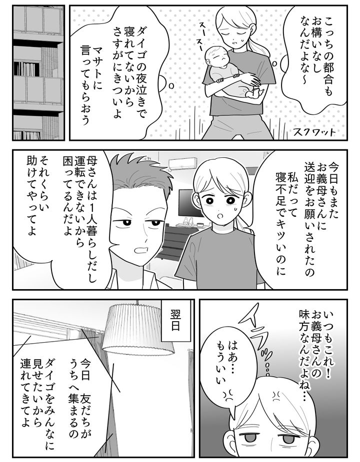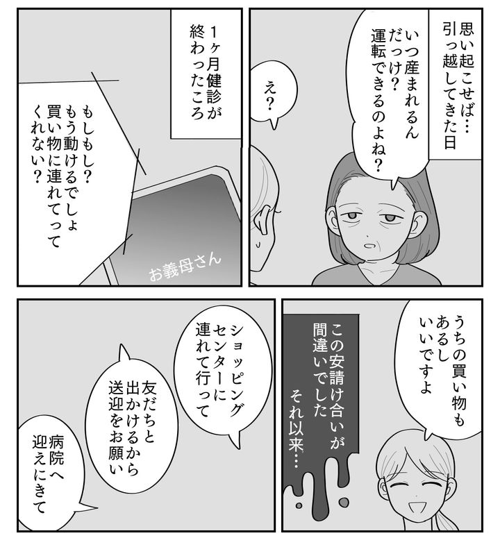 まさか義母の送迎係にされるとは思わず、自分の買い物ついでに車を出してあげてしまった私。それ以来、義母はこちらの都合などお構いなしでお願いしてきます。けれど最近は息子の夜泣きに振り回されて、私もろくに眠れていません。