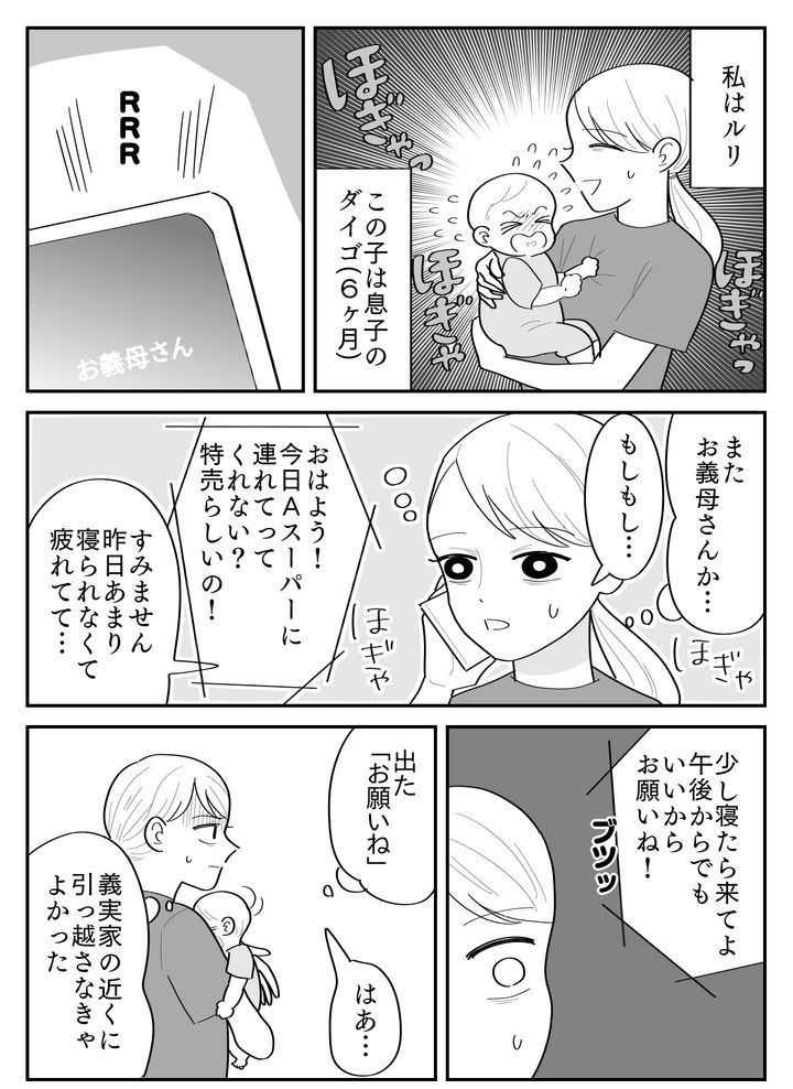 私(ルリ)は生後6ヶ月の息子(ダイゴ)を育てるママです。現在は育休中。出産の少し前、私と夫(マサト)は家族が増えることに備えて、狭い賃貸からファミリータイプの物件へ引っ越しました。けれどそのとき義実家のそばのマンションを選んだのが間違いだったのです……。1人暮らしの義母は、車の運転ができる私を何かと頼りにしてきます。こちらの都合なんてまったく構わず、「お願いね」の決まり文句で無茶な要求を押しつけてくるのです。