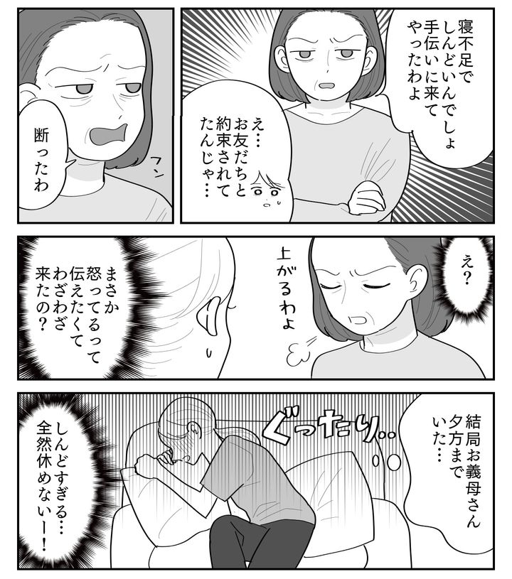 義母の無茶な要求は、買い物や病院の送迎だけではありません。孫を見せびらかしたいから家に連れて来いとか、友だちと遊びに行くから車に乗せて行けとか……。身体が辛いので断ると、午後になってなんと義母が家にやってきました。