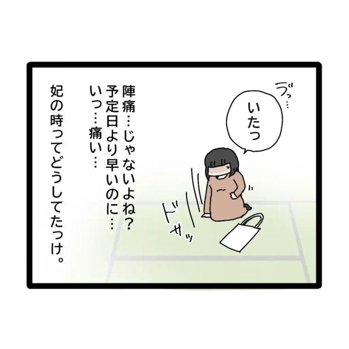 あまりの痛みに座り込みながら「陣痛・・じゃないよね?予定日より早いのに・・いっ・・痛い・・。妃の時ってどうしてたっけ?」とパニックになるきみこ。