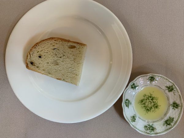 続いて、ブラックオリーブとローズマリーのフォカッチャに、澄み切ったオリーブオイルが添えられて運ばれてきました。どちらも香り高く、あっという間にお口の中に・・・美味しい!