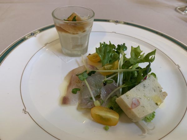 まずは、新玉ネギのムースとヒラメのカルパッチョの盛り合わせ。
