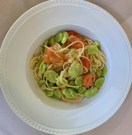 こちらは「蔵王産そら豆とフレッシュトマトのスパゲッティ」。目にも美味しい旬の彩りです。